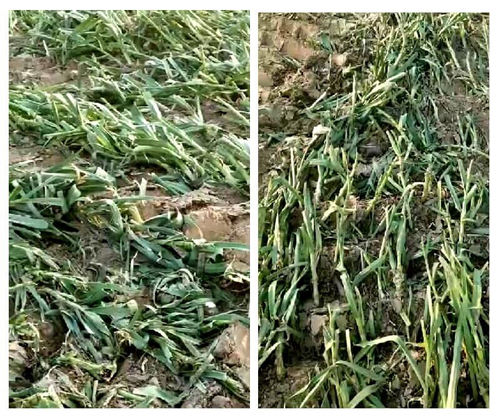 2020年4月29日,青岛阿拉丁投资公司领导与董口镇工作人员用推土机又强行把30多亩马上收获的大蒜全部毁坏(毁坏大蒜有视频为证),种蒜的村民求他们说:求你们再给我们一点时间,我们现在就刨!但他们根本不理,还是我行我素。眼看着马上就要丰收的150多亩小麦和30多亩大蒜被强行毁坏。不光毁坏小麦和大蒜田,还限我们4天时间把祖坟迁出去,如果不迁就用推土机给推了或埋下面(有村民录音为证)。村民们欲哭无泪,痛心不已。