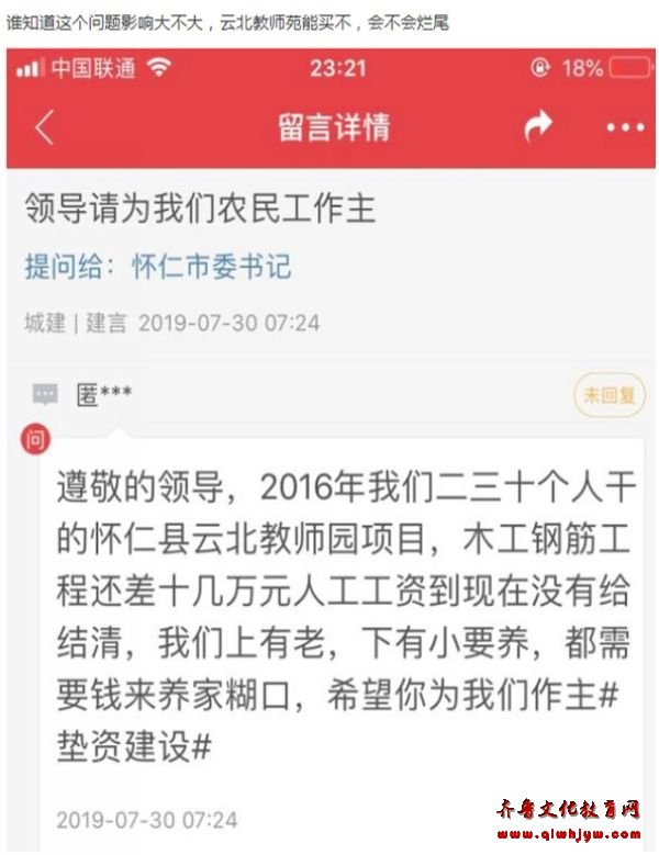 1、违建项目成了农民工的讨薪所。2019年7月30日,农民工在网上给怀仁市委书记留言内容如下: