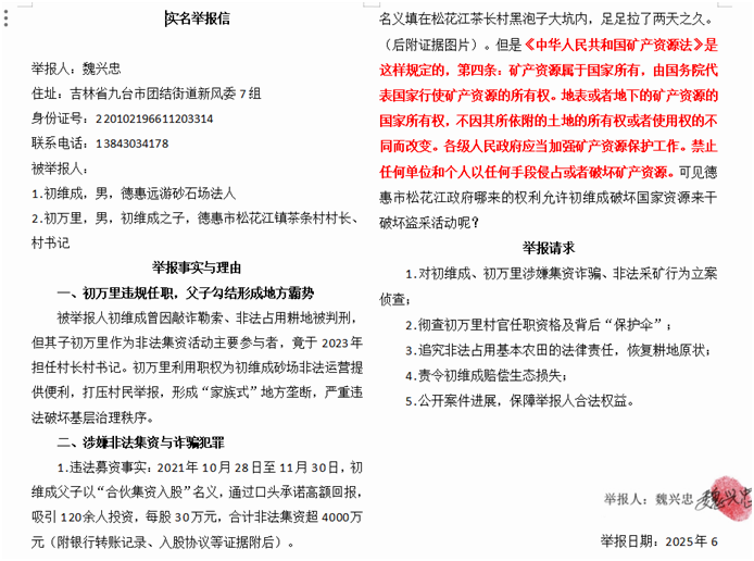 本站讯 近日,吉林省九台市团结街道新风委7组居民魏兴忠再次向相关部门及媒体实名举报德惠远游砂石场法人初维成及其子、德惠市松花江镇茶条村村长兼村书记初万里,指控其存在包括集资诈骗、非法采矿、非法占用基本农田等多项严重违法犯罪行为。据魏兴忠提供的证据,当地政府虽然认定初维成父子构成非法采砂,并声称会加大监管力度,但是初维成至今仍昼夜不停的非法采砂,对基本农田和生态环境造成严重的破坏。