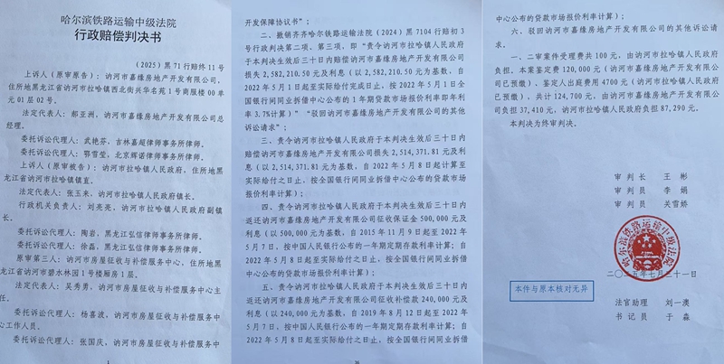 本站讯 近日,黑龙江讷河市嘉缘房地产开发有限公司(下称“嘉缘房产”)正式向黑龙江省高级人民法院提交行政再审申请书,请求撤销哈尔滨铁路运输中级法院(2025)黑71行赔终11号行政赔偿判决书,重新判定讷河市拉哈镇人民政府(下称“拉哈镇政府”)在行政协议纠纷中的全部违约责任,并索赔包括前期投入、预期利润、利息在内的近1800万元损失。这场历时数年的行政协议及赔偿纠纷,因举证责任划分、损失认定等核心争议,再度进入公众视野。