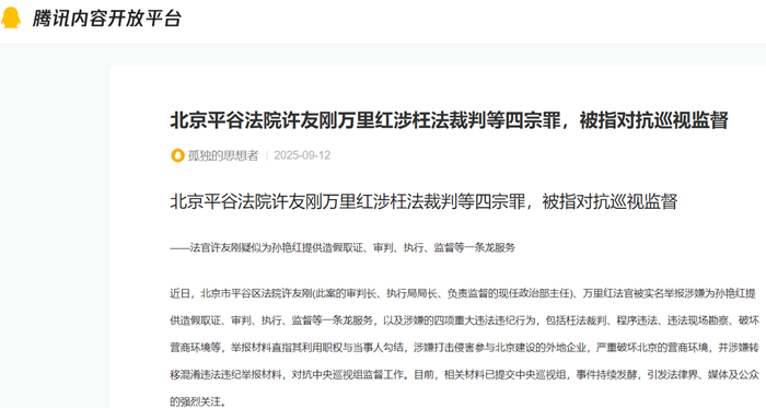 2025年8月9日,伟鹏公司正式向中央第十巡视组、北京市纪委监委等多部门邮寄举报材料,指控平谷区法院法官许友刚、万里宏在审理中涉嫌程序违法、证据采信失当、枉法裁判。
