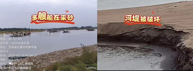 徐连海提供的多段现场视频进一步佐证了盗采行为。2024年6月3日的视频显示,湛江寺门口的审批清淤区内无任何施工船只,而德惠市许家店采区中,多艘归属五棵树采区的采砂船正在紧锣密鼓地盗采砂石,“清淤”说辞不攻自破。