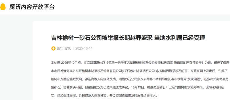 本站讯 2025年10月初,多家网络媒体以《德惠一男子实名举报榆树砂石公司长期越界盗采 恳请异地严查并追责》为题,曝光了德惠市市民徐连海实名举报榆树市鸿福砂石销售有限公司(以下简称“鸿福砂石公司”)长期越界盗采砂石的事。文章在网上发出后,引起了榆树市方面的强烈反响。徐连海等人向媒体反馈,鸿福砂石公司多次去德惠市水利局和长春市水利局“反映问题”,还多次找到德惠勇盛砂石厂协商解决问题,但是目前双方仍然未能达成协议。10月13日,德惠勇盛砂石厂已经向榆树市水利局举报,该局法制科证实,已经受理举报,近日将派人调查核实,并会将调查结果及时反馈给举报人。