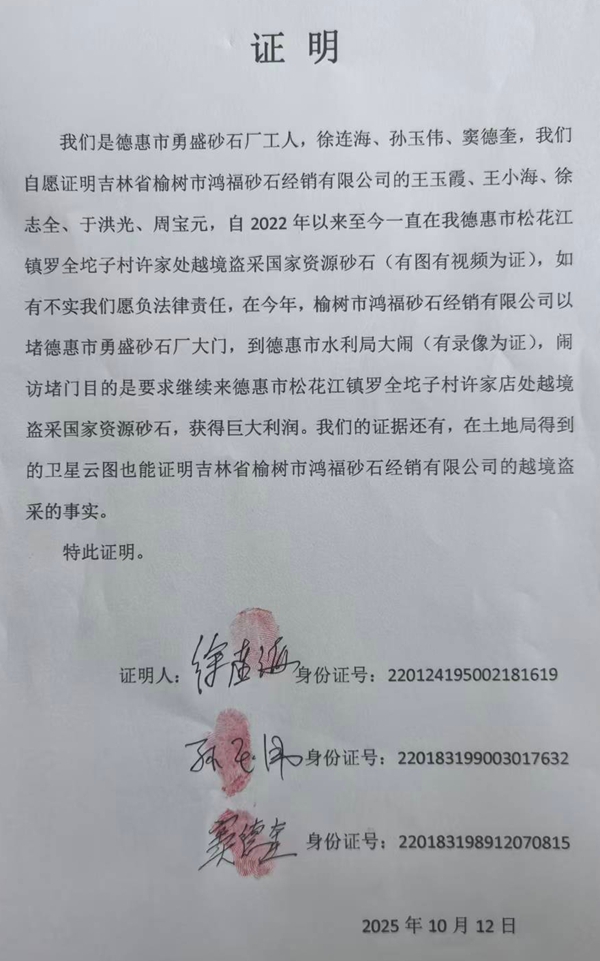 徐连海等人在实名举报的同时,向媒体和水利局提供了多名村民的证实材料和大量卫星云图截图、现场视频、砂石外运记录等完整证据。其中,有几位村民(在勇盛砂石厂打工)证明鸿福砂石公司的王玉侠、王小海、徐志全、于洪光、周宝元,自2022年以来一直在德惠市松花江镇罗全坨子村许家店处越境盗采国家资源砂石(有图有视频为证)。他们还证实,在今年,鸿福砂石公司还封堵德惠市勇盛砂石厂大门,到德惠市水利局大闹(有录像为证),闹访堵门目的是要求继续来越境盗采国家资源砂石,获得巨大利润。这些人均称随时配合相关部门调查,并愿意接受法律监督。