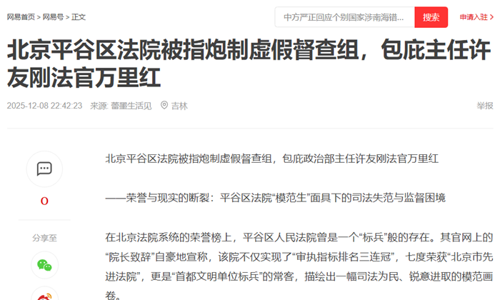 北京平谷区法院被指炮制虚假督查组,包庇政治部主任许友刚法官万里红