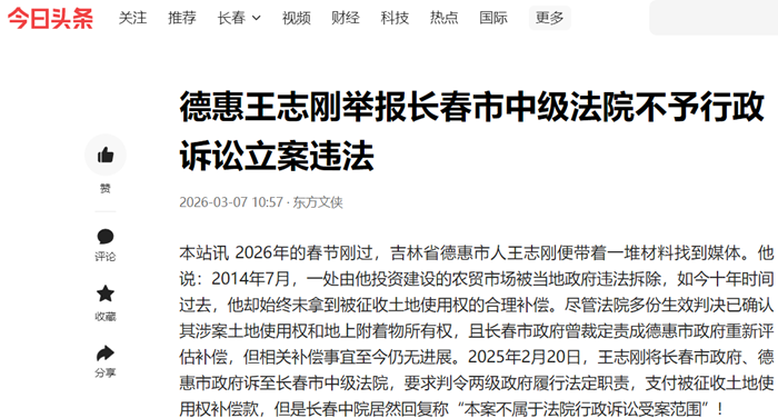 本站讯 2026年的春节刚过,吉林省德惠市人王志刚便带着一堆材料找到媒体。他说:2014年7月,一处由他投资建设的农贸市场被当地政府违法拆除,如今十年时间过去,他却始终未拿到被征收土地使用权的合理补偿。尽管法院多份生效判决已确认其涉案土地使用权和地上附着物所有权,且长春市政府曾裁定责成德惠市政府重新评估补偿,但相关补偿事宜至今仍无进展。2025年2月20日,王志刚将长春市政府、德惠市政府诉至长春市中级法院,要求判令两级政府履行法定职责,支付被征收土地使用权补偿款,但是长春中院居然回复称“本案不属于法院行政诉讼受案范围”!