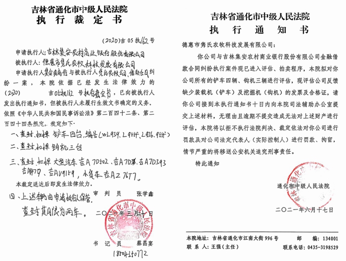 然而,事情并未就此平息。在高院和长春中院介入调查并纠正了错误冻结行为后,2021年3月,通化市中级法院因为一桩贷款纠纷,拖走并以低价拍卖了隽氏公司用国家专项资金通过招投标采购来的专用车辆和专用设备,并且再次冻结了在德惠市农业环境保护与农村能源管理站账户上的563万元中央预算投资专项资金。据隽氏公司提交的执行异议申请书显示,通化市中级法院下达的(2020)吉05执162号执行裁定书 、(2023)吉05执恢38号执行裁定书、(2023)吉05执恢38号协助执行通知书,均不符合相关法律和政策规定。