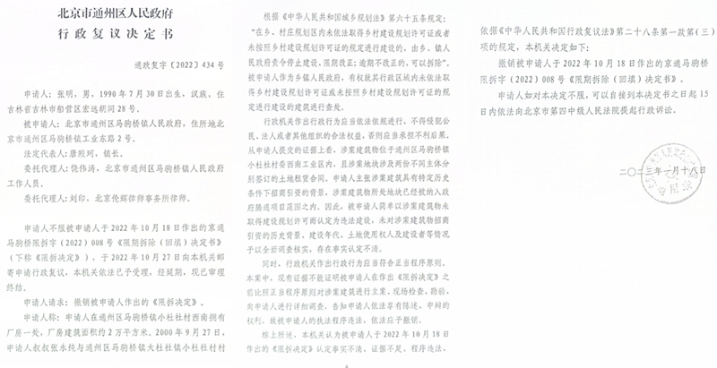 2022年10月18日,北京市通州区马驹桥镇政府作出的《限期拆除(回填)决定书》(京通马驹桥限拆字(2022)008号),及2022年10月24日作出的《强制拆除决定书》(京通马驹桥限拆字(2022)008号),这两份限期拆除决定书均被通州区人民政裁决违法、撤销。