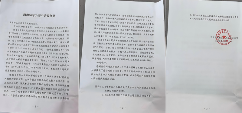 裴巧翠并未因此而放弃。2025年2月12日,汇东公司收到麦积区政府办出具的《政府信息公开申请答复书》,及附带的三阳川隧道及引线工程建设用地批复、土地征收启动公告、征地补偿安置方案和征地公告等四份文件。
