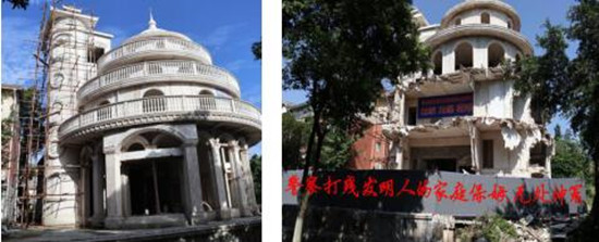 (左:28小时建成毛坯房,右:杨东升派500人6台挖机毁)