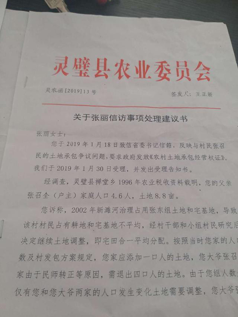 2019年3月20日灵璧县农委的“关于张丽信访事项处理意见书”里也明确的建议暂缓对她家和张某民的土地确权,建议禅堂乡人民政府继续开展纠纷双方的调解工作。待争议得到妥善解决后,按照程序进行确权颁证。