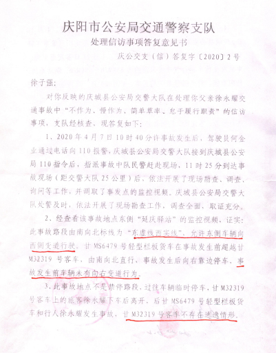 答复意见书对庆城县交警大队、庆阳市交警支队遗漏交通事故当事人甘M32319号“宇通”客车的行为视而不见。本起事故起因是甘M32319号“宇通”客车违法停车引起的。甘M32319号“宇通”客车和乘员(徐某耀)形成事实上的客运合同关系,客车有将乘员安全运送至目的地的义务,客车对乘员(八十岁的老人徐某耀)未尽到扶助、提示义务;客车长时间停靠路面卸载货物,并非临时停车,而是特殊情况停车,阻碍直行车道,阻挡行人视线,应把车辆移动到路边安全区域停放,同时开启紧急情况双闪警示灯,把停车安全警示标识牌放置车辆后方合适位置,用于提示后方来车注意避让,但甘M32319号“宇通”客车均未做到,交通违法行为明显。事故发生后,未对伤者施救、未保护现场、未主动报警,现场未接受交通管理部门调查,反而溜之大吉。两级交警部门对该客车的违法行为视而不见,认定“该客车与本起事故无关,在本起事故中无责”,反而将责任推给一个受害老人的做法,不仅令人费解,而且令人心寒。