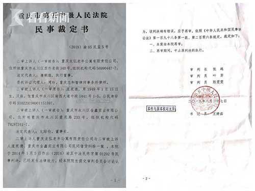 2019年8月27日,重庆五中院作出民事裁定:“经本院院长提交审判委员会讨论认为,判决确有错误,应予再审。裁定由本院再审;再审期间,中止原判决执行。”