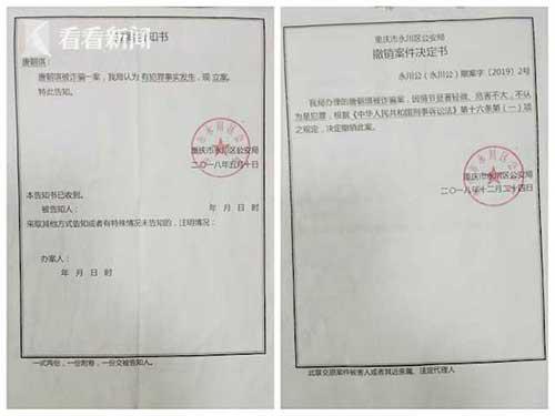 永川警方的立案通知书和撤案决定书。