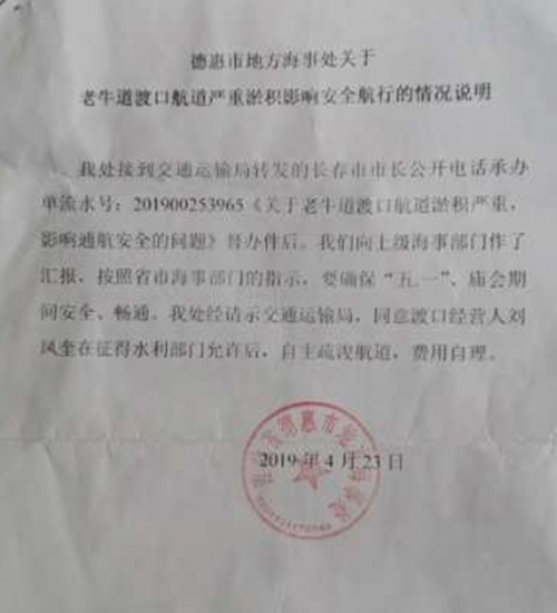 据村民们介绍,德惠市曾经给吉林省水利厅河道管理局打过报告,但是至今没有下文。8月6日,记者来到吉林省水利厅。工作人员告诉记者,此事归河道管理局管,但是当记者电话联系到一位宋姓负责人时,宋称此事不归他们管。记者提到村民们说,他和几名工作人员曾经到老牛道渡口实地测量过。但这位宋姓处长称:“我们只是路过看看。”根据村民们的回忆,德惠市曾经给河湖管理局打过报告,其负责人叫杨某。记者又电话联系这位杨姓领导。但这位杨姓领导同样称:“此事不归我们管”,他还称:“我不主张清淤,因为涉及到采砂问题,但是应该做航道疏浚,”他又让记者联系航道管理局。
