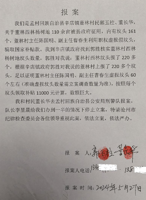 2024年5月25日,郭玉柱与村民董长华向县纪委监委、县公安局实名举报陈国明涉嫌诈骗。据郭玉柱描述,县公安局提供的村民领款表格显示,上报坟头数量为199座,其中包含多个“无名坟”,与实际情况严重不符。