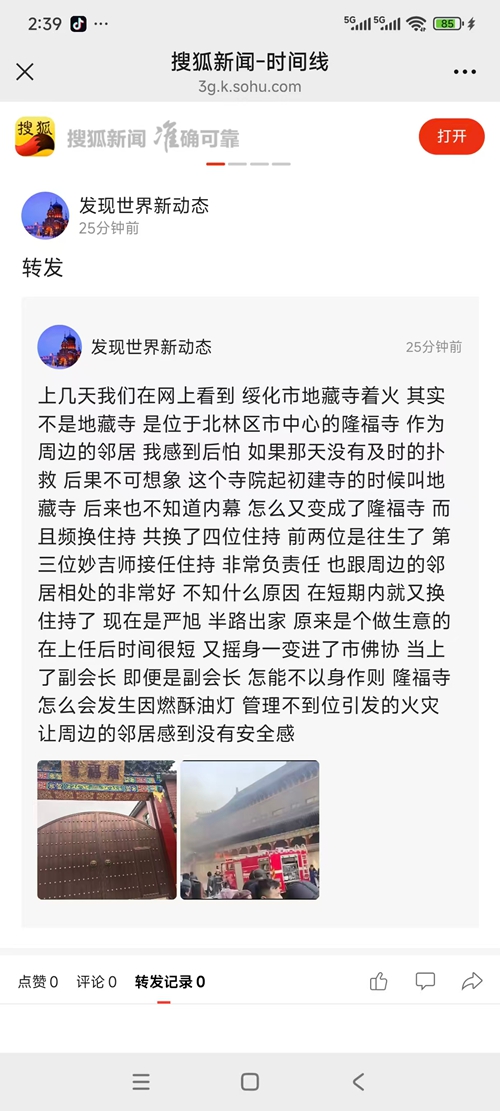上几天,我们在网上看到绥化市地藏寺着火。 其实不是地藏寺,是位于北林区市中心的隆福寺。作为周边的邻居, 我感到后怕, 如果那天没有及时的扑救, 后果不可想象。 这个寺院起初建寺的时候叫地藏寺, 后来也不知道内幕 怎么又变成了隆福寺 ,而且频换住持, 共换了四位住持。前两位是往生了, 第三位妙吉师接任住持 ,非常负责任, 也跟周边的邻居相处的非常好。 不知什么原因, 在短期内就又换住持了 。现在是严旭,半路出家,原来是个做生意的 ,在上任后时间很短 ,又摇身一变进了市佛协 ,当上了副会长。 即便是副会长,怎能不以身作则? 隆福寺怎么会发生因燃酥油灯 、管理不到位引发的火? 让周边的邻居感到没有安全感。