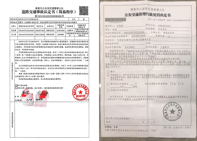本站讯 2025年12月17日傍晚,吉林省德惠市松花江镇罗圈坨子村的乡村水泥路上,一声碰撞打破了冬日的静谧。村民宋士君驾驶吉AP69M7号小型普通客车沿路由西向东行驶,行至西许家店屯8社至9社路段时,被同向前方闫凤新驾驶的吉AFJ0622号小型轿车追尾,两车不同程度损坏。