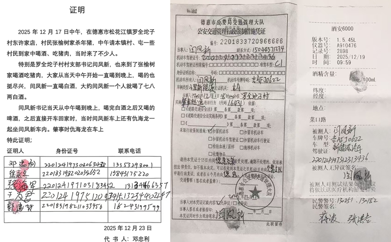 为证实闫凤新醉驾肇事的真实性,宋士君提交了由邓忠利、徐永立、仇海龙等6名一同聚餐的村民联名签署的书面证明。证明材料明确记载,闫凤新在宴会上持续饮用白酒和啤酒,醉酒后驾车离开,当时乘车人仇海龙也在其车内。所有证明人均提供了身份证号码及联系电话,以佐证证言的真实性。