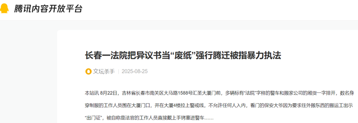 本站讯 8月22日,吉林省长春市南关区大马路1588号汇圣大厦门前,多辆标有“法院”字样的警车和搬家公司的厢货一字排开,数名身穿制服的工作人员围在大厦门口,并在大厦4楼拉上警戒线,不允许任何人入内,看门的保安大爷因为要求往外搬东西的搬运工出示“出门证”,被自称是法官的工作人员直接戴上手铐塞进警车……
