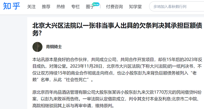 本站讯原本是良好的合作伙伴,共同成立公司,共同合作开发项目,却在15年后的2023年反目成仇,对簿公堂。2023年11月28日,北京市大兴区法院(下称大兴法院)的一纸判决书,不仅让双方持续15年的商业合作彻底走向终点,也让小股东彭九来背负巨额债务被列入“老赖”名单,从此“社会性死亡”。