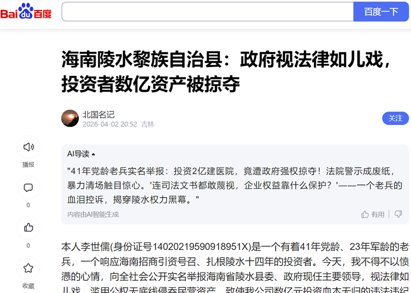 本人李世儒(身份证号14020219590918951X)是一个有着41年党龄、23年军龄的老兵,一个响应海南招商引资号召、扎根陵水十四年的投资者。今天,我不得不以愤懑的心情,向全社会公开实名举报海南省陵水县委、政府现任主要领导,视法律如儿戏,滥用公权无底线侵吞民营资产,致使我公司数亿元投资血本无归的违法违纪问题。