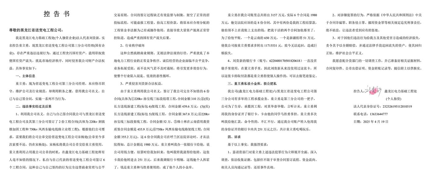 刘贵新愿意配合贵部门的一切调查工作,并已准备好相关证据材料,合同复印件、公章出借证明、资金转账记录等,随信附上以供核实。控告人刘贵新衷心希望黑龙江省送变电工程公司有伞打伞、有黑打黑。